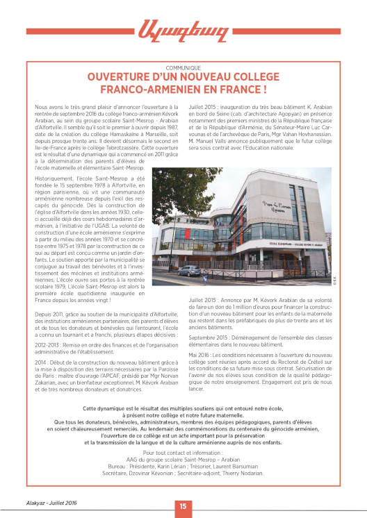 Ouverture d’un Nouveau Collège franco-arménien en France !